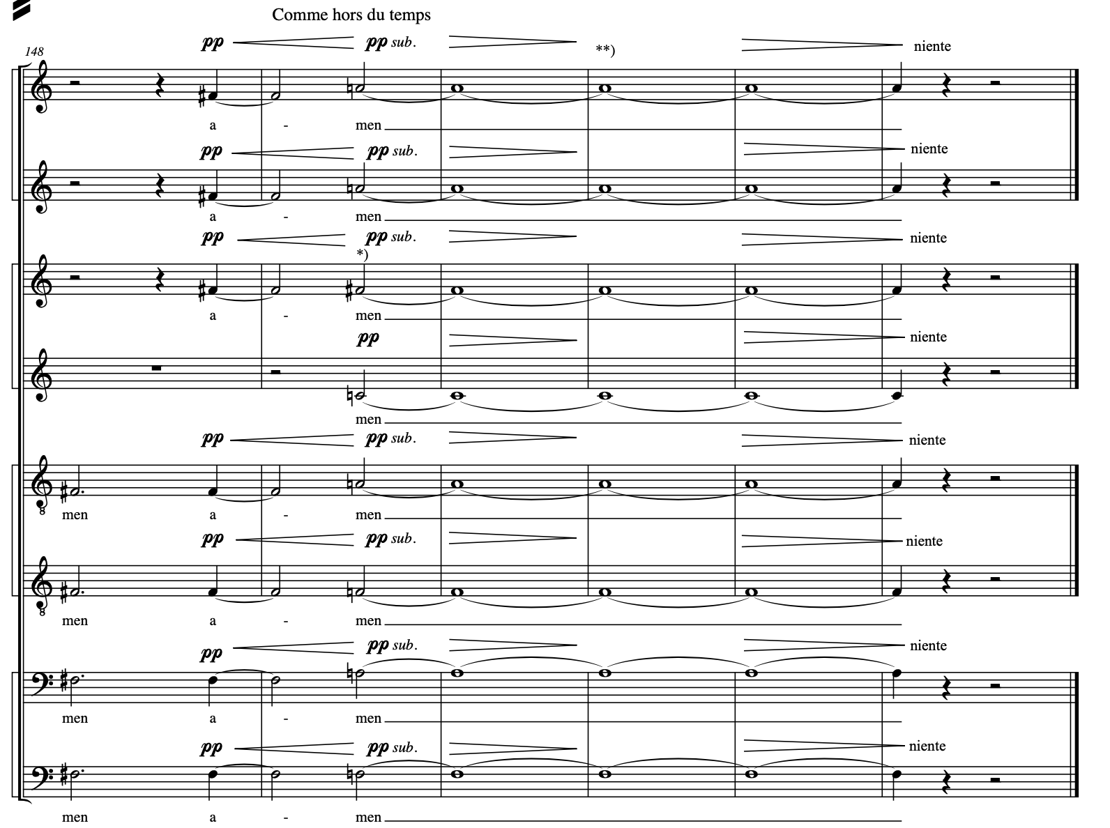 Le Grand Pater noster a été composé en 2012 pour huit voix sur le texte du notre Père alternativement en latin, en grec, en swahili, en maori et en japonais. On peut y déceler l'influence du "Sanctus" de la Bonner messe.